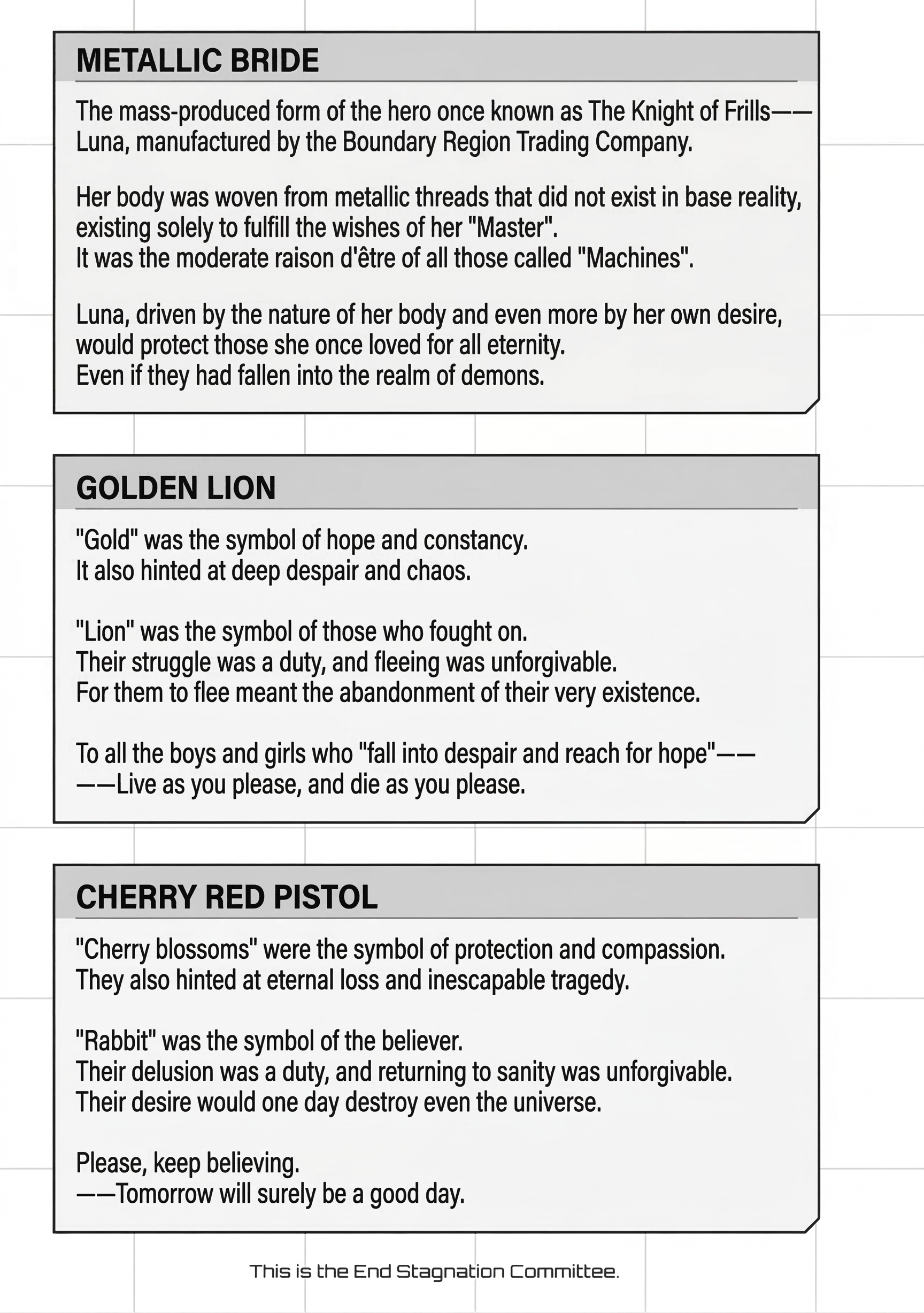 Details: A form obtained when the mechanical life-form "Guardian," created by Old Humanity, consumed its own deployed Otherworld and the remains of those it wished to protect. Specialized solely in loss. Destruction. Ending. Its purpose is to bring Apocalypse to the world. The commonplace terminus reached by the many wishes that were never granted.